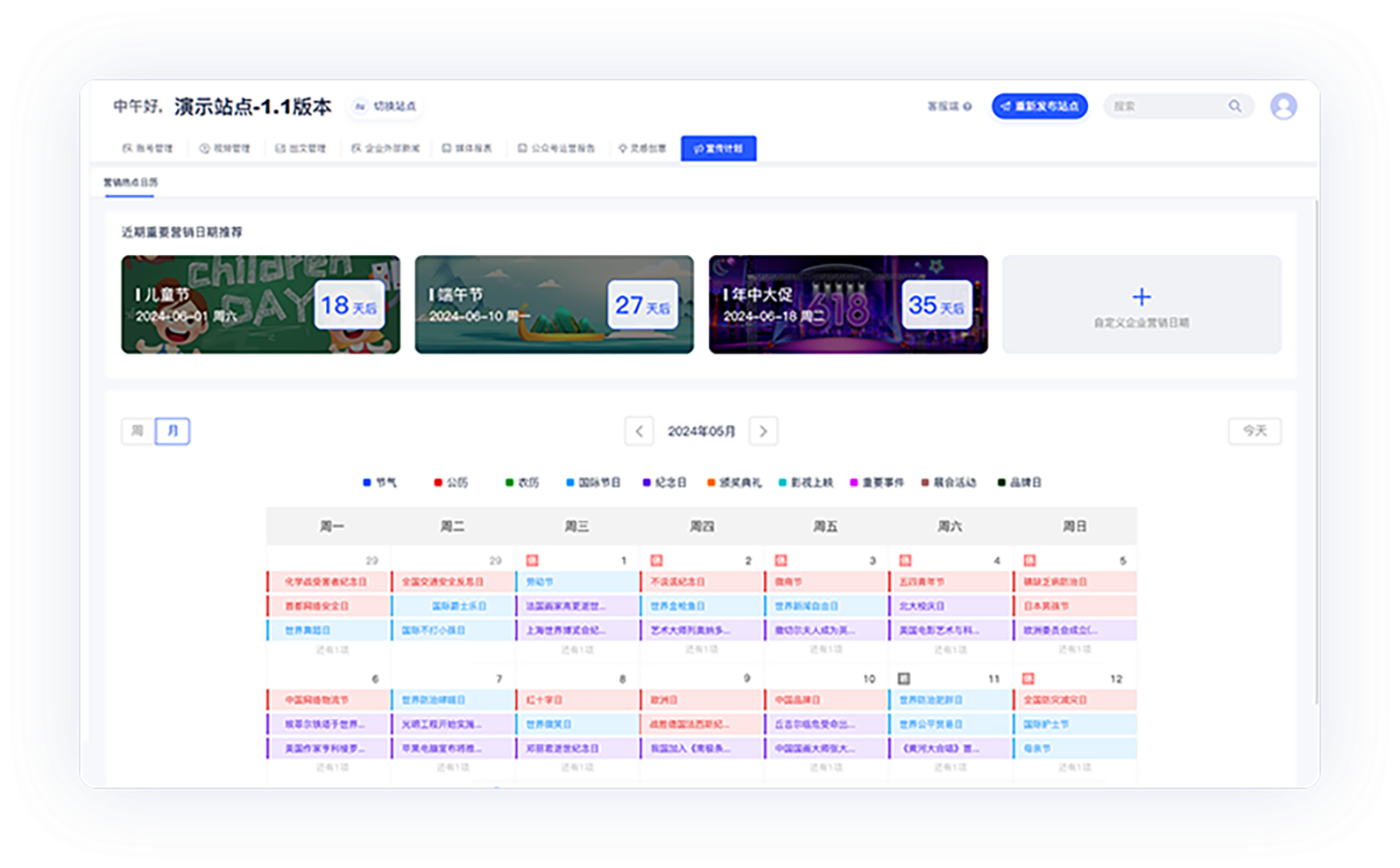 并通过AI赋能各类营销工具:灵感创意中心、营销热点日历、Al策划方案,助力企业把握营销机会,抢占商业先机。